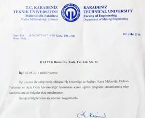 Karadeniz Teknik Üniversitesi, Maden Mühendisliği Bölümü Öğretim üyeleri Prof. Dr. Ayhan K. , Doç. Dr. Bayram E. , Yrd. Doç. Dr. Ferdi Cihangir’in katılımlarıyla Üniversite ile şirketimizin personellerine yönelik eğitim ve sertifikasyon programı düzenlenmiştir. Mesleki eğitimlerinde Üniversite ile koordineli çalışmalarımız devam etmektedir.